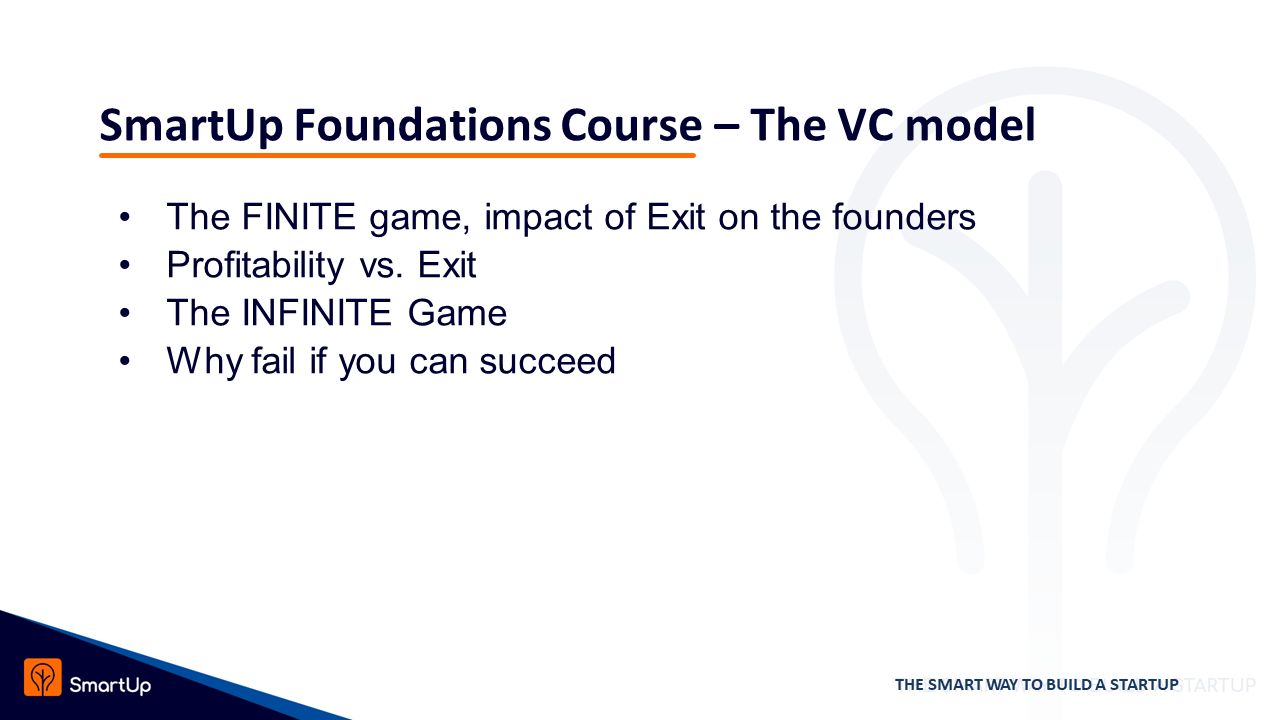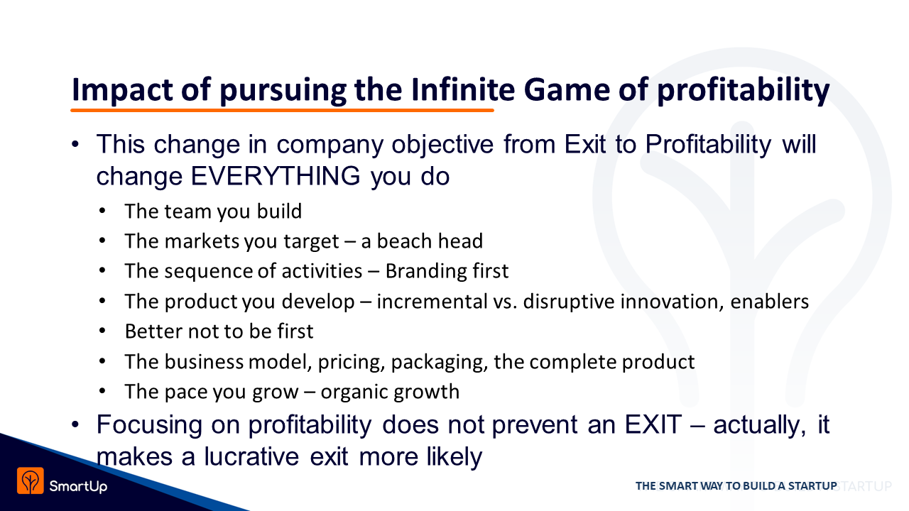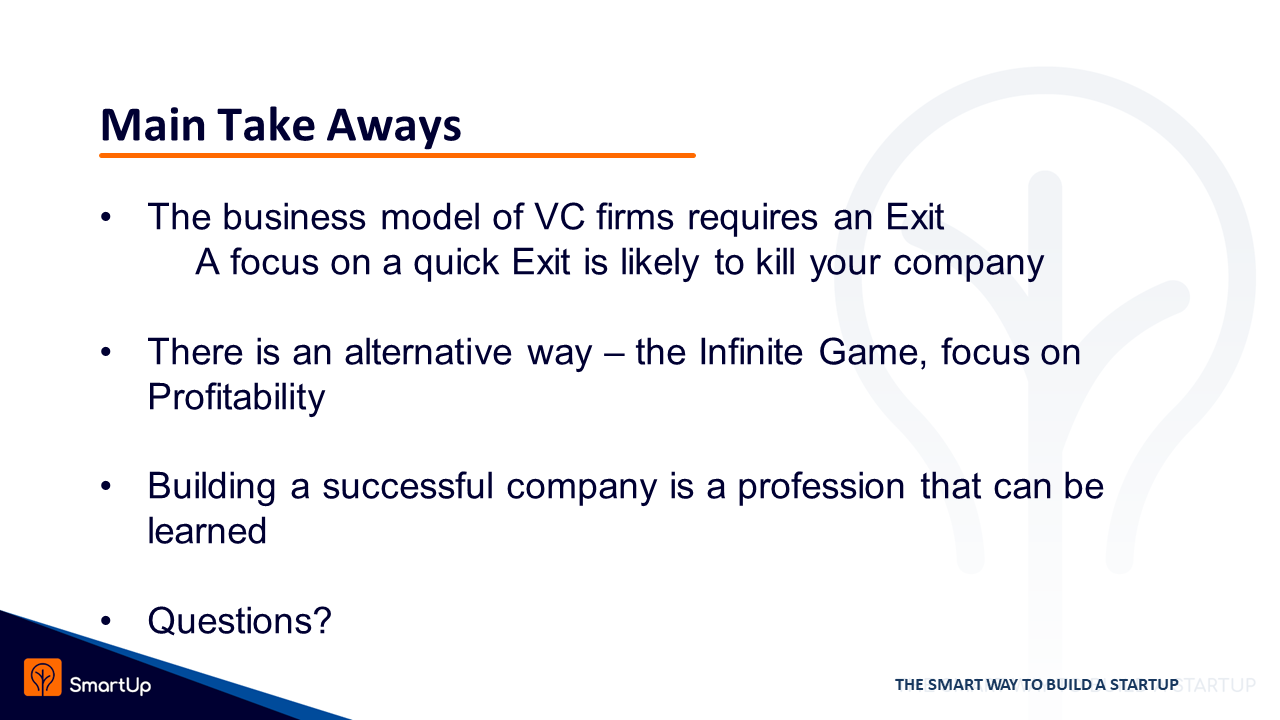 So as I said, the takeaway is there are more options than going the vc ways you can make good amount of money a happy company and infinite game by taking a different direction and building a successful company is a profession and we are keen on proving that we can teach how to build a good company can promise success or I can promise to try. Questions? Yes. Talking about the model. In the end, to be profitable, in order to be profitable somehow you need to get money. It takes time. Usually the one who gives you this money are demanding of you to go based on different strategies that you show. Right? So how do you do that? You find only small angel investors on the way. I don’t have a good answer for you.