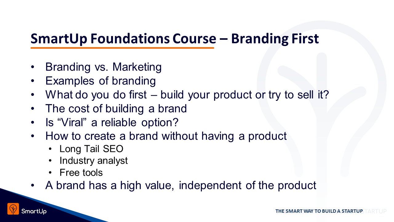 So when you create a brand, it has a value independent of the product you were planning to build. So this investment that you do in the brand already has a payback without you building the product. I know it sounds crazy, but the Kardashians are worth a lot of money because they have a brand. Tesla saves a lot of money because they have a brand. So it has tremendous value. People think about brand being viral. Well, you can also win the lottery. But that’s not a business model. I don’t know how to do anything viral now, how to create a brand without having a product. So I have a few ideas. I’ll talk about them at length later on. Long tail SEO to become an industry analyst. Free tools there are many things that you can do.