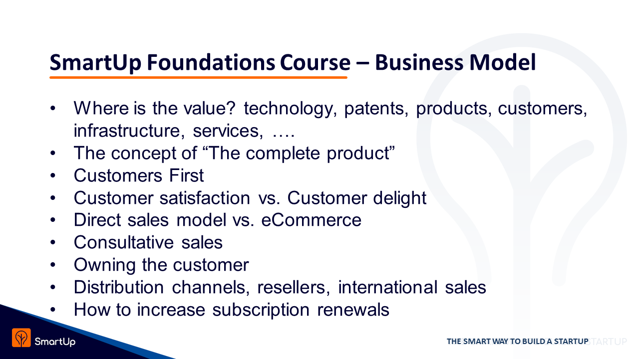 Each company needs to find what works for them. Business model. So for you to build a business, then you need a business model. There is a business model canvas. That’s what I’m showing in here. It’s kind of a structure to how you think about a business model. I put it in here because everybody’s talking about it. I don’t really like it. So I’m not going to teach that one, but I’m going to show you other things. But it’s just a simple model. The main questions I’m asking myself is where is the value that your business brings? Is it technology, patents, product, customers, whatever it is, where is the value that you bring to the market? And the other thing is the notion of a complete product. The complete product is a really simple concept. People don’t want your product.