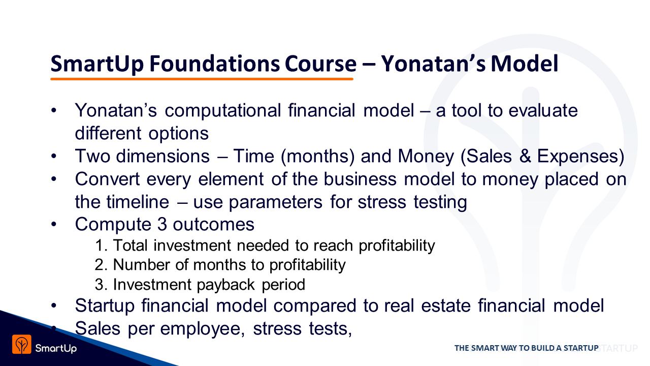 So I’m building a model that will allow you to calculate your business. And the calculation goes along two dimensions. One dimension is time. Every activity you do falls in a certain time and it has money involved, either sales, income or expenses. So you have a matrix, right? Time. Every column is a week, a month, a year, whatever it is, and lines. And you want to convert any idea and every element in your business model to money on this timeline. Okay. And I want you to use parameters. We grow every month by 5% in sales, by 2% in sales, by 10% in sales. So you have parameters that you can decide to play with and you want to compute, and that’s the key in here. You want to compute three outcomes. Number one is the total investment, all the money you lose every single month.