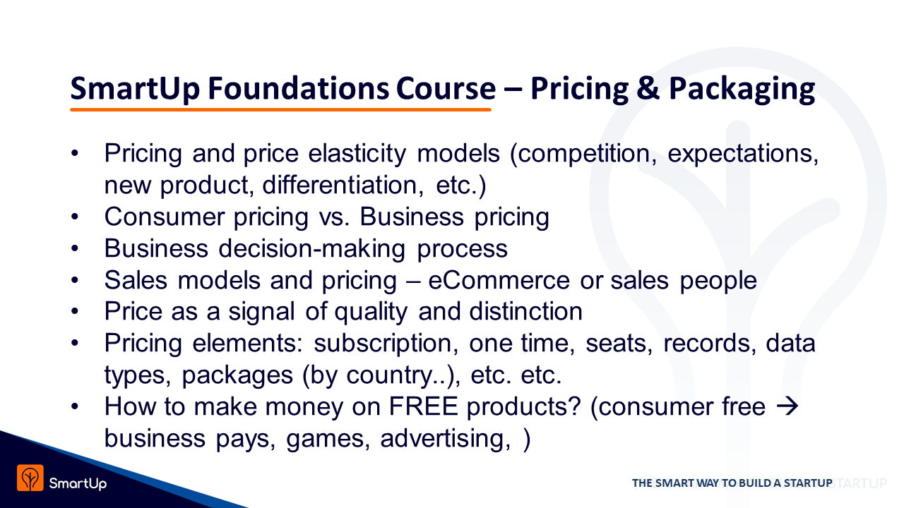 You go and you buy perfume and it costs, I don’t know, $50 for a small bottle. Why, this doesn’t cost them $50. But it sends a message. This is a really good one. When I say price well, price is even not well defined. So how do you create a price? So think about CRM. How do you charge for CRM by seat user, by the amount of data, by the number of records they keep, by transactions by. You name it. You can create a pricing model that will be as complicated or as simple as you wish. And it’s really an art and a lot of thinking on how you build the pricing model. And the last question, of course, is, how do you make money on free products? The example I like a lot is Zoom communication, the zoom we all use for meetings.