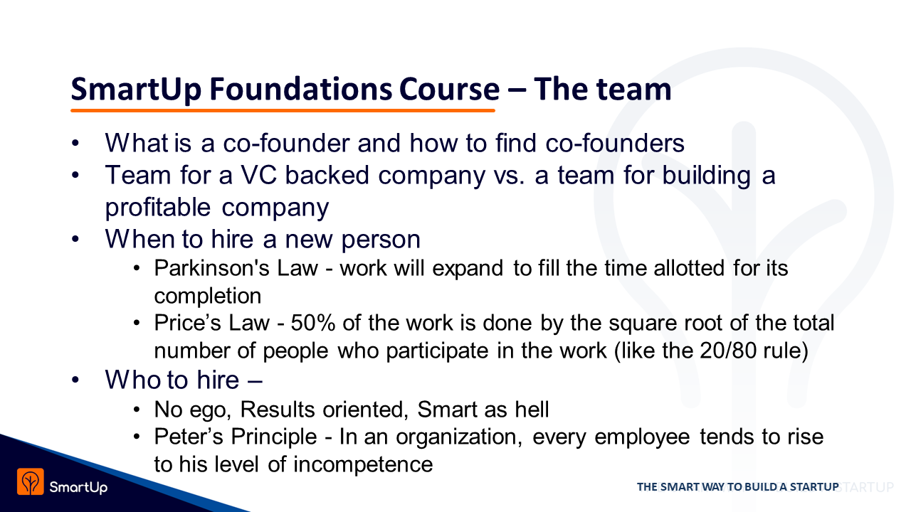 And then we will finish this and take a break. What is a co founder? People come to me and they have two co founders, three co founders. Who are they and how do you find co founders? I’ll talk about it when we get there because I don’t want to say anything that might irritate people here. So remember that a team that VC’s expect is probably different than the team you are going to build if you want to build a profitable company. So the direction you want to take your company dictates what kind of a team you’re going to build. And you need to think about it. When do you hire a new person? Say what? When I need. So I’ll bring you a few laws that we will talk about them later. They’re very funny.