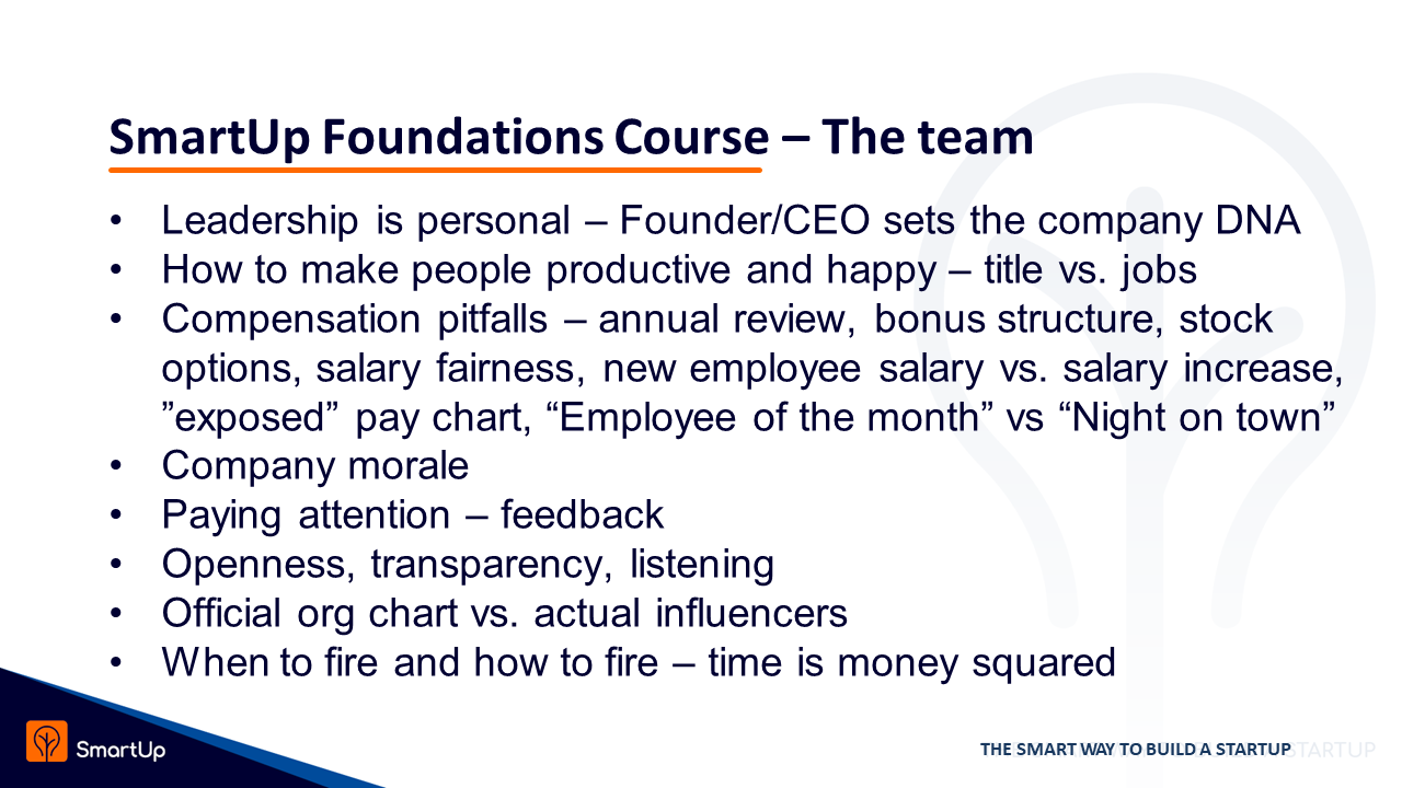 And then you take the team and you kind of shift the jobs until everybody gets what they really like doing, regardless of their title. No ego, remember? No ego. And then everybody gets up in the morning and they’re really excited because today they’re going to do what they like doing. They can’t wait to get to work because they like doing what they do. It’s much better than taking prisons in your job. You also have to write press releases and I can’t write two words, you know, so what if I’m in marketing? I don’t like writing compensation pitfalls. I will not go in because I think we need to take a break. But tons and tons of mistakes about compensation and people don’t understand why people are angry. So you have to be very careful about it.