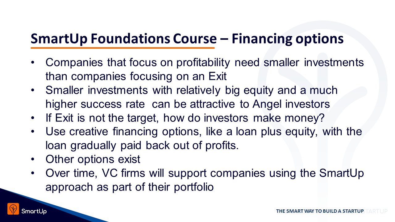 I won’t tell you who they are, because they wanted anonymity. So this whole process of focusing on profitability and small investments can be opening up the whole financing market to some other alternatives. Well, if exit is not the target, how do investors make money? And I’ll talk about that. And we also develop creative financing options as part of the smartup academy. That’s one of the subjects. We’re still thinking about debating talking, because obviously, even if you need small investment, you still need an investment, and we need to find ways to provide it to you. My hope is that VC firms will also realize at some point that with the amount of money they have, they can build ten times as many companies with a much higher success rate. And it’s not very smart to spend $50 million on a company that fails.