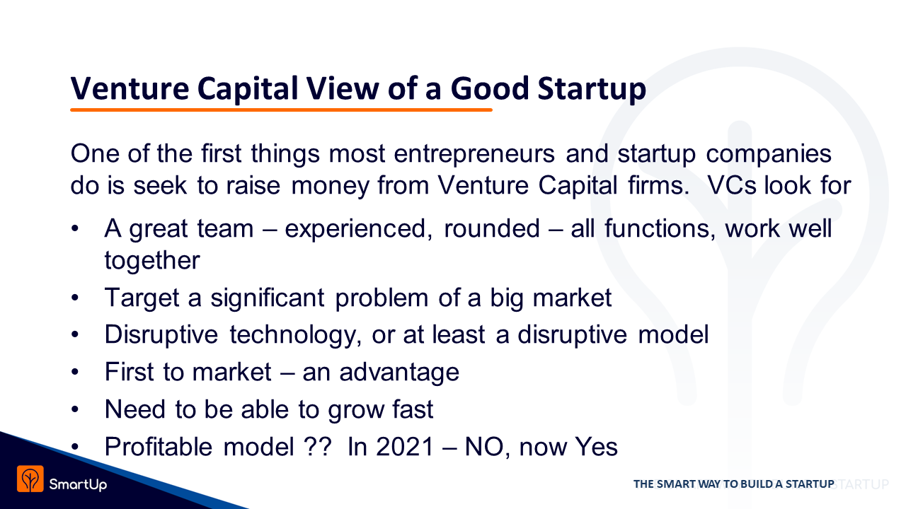 So the chances of even getting through a VC is eight out of 1000. I was visiting a VC firm that gave a lecture and they were telling people that they see a thousand business plans a year and meet with a thousand groups of people. Out of those, they meet second time with 200 companies or groups, and out of the 200, they at the end, invest in eight. So the chances of even getting through a VC is eight out of 1001. Out of ten starts to look great. Second thing they want is they want a big market. We want you to solve something big. The bigger the better, you know, maybe a machine that can fly and dive and kills and whatever, you know, the bigger the dream. So, profitable model. So until 2001, nobody was talking about profitability.