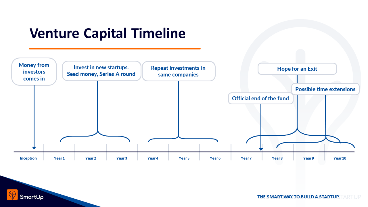 These groups, you know, pension funds and insurance companies put money in and they won’t get money out. They have nothing to do with 2% of a successful company, that they cannot liquidate the investment. So an Ipo or an MMA is a must. It’s not an option. It’s not nice to have. It’s a must for a venture capital firm. Bear that in mind. So, some of the behaviors I’m going to describe to you really don’t come because they’re stupid, because they don’t know what they are doing or anything else. It comes because their financial structure dictates it. So, let’s look at the timeline of it. So, inception, they raise money from the investors in year one to year three. They make the investment, the seed money, the series a. Essentially, they select the companies, they are going to invest money.