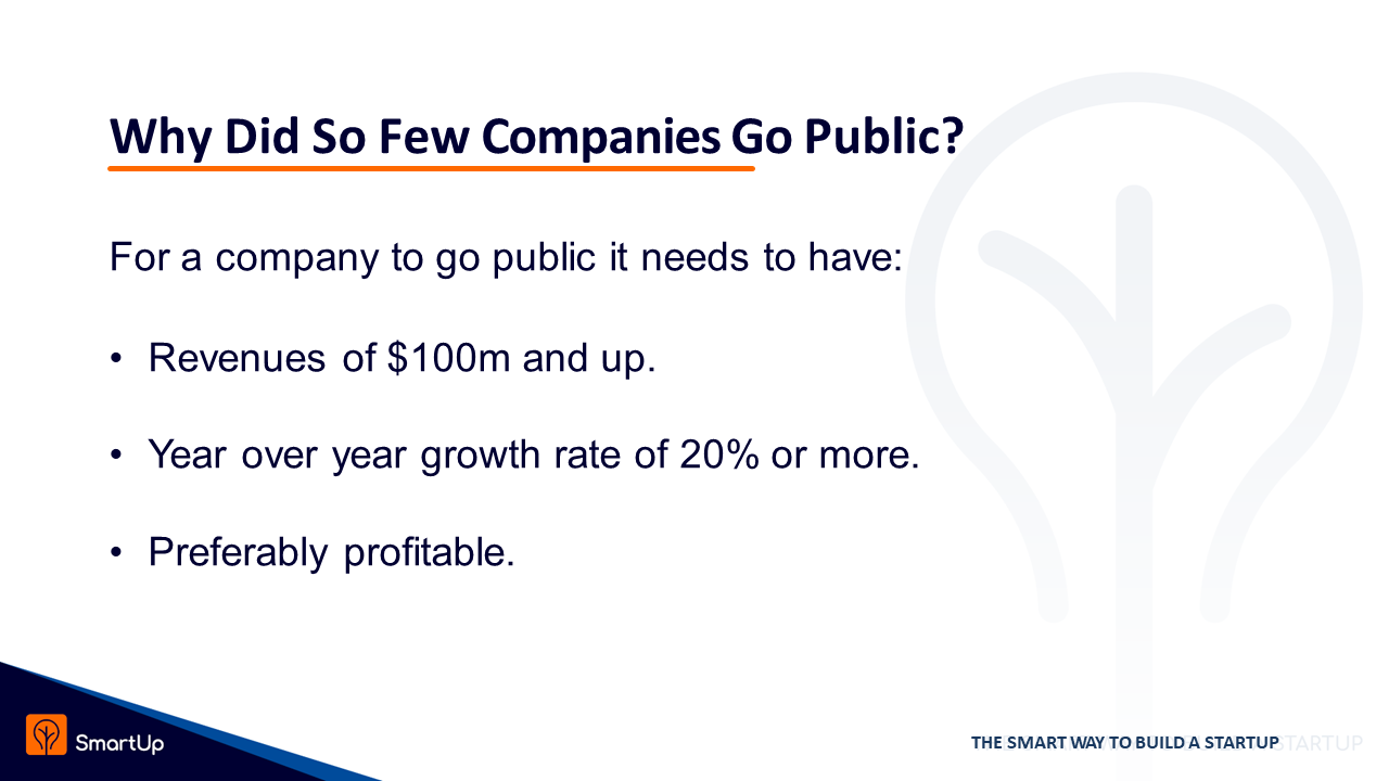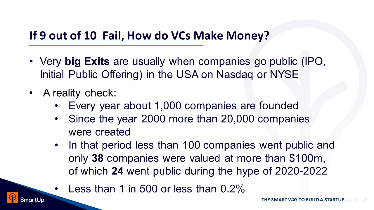 So since the year 2000, we looked at all the companies, startup companies, that started from year 2000 and onward, and there were about 20,000 companies, a little more, that were created in that period. And now look at the numbers. Less than 100 companies went public. 20,000 companies north of 20,000 companies. And we counted, okay, Wuti sat down and counted how many of them? Less than 100. But if we lower it, we said, okay, we only want companies that went public at a valuation above 100 million. Why we did that because there were a lot of companies like pharma companies, that basically, instead of raising money from investors, raised money from the IPO market, and they usually went for very low valuations, 50 million, 40 million, things like that.