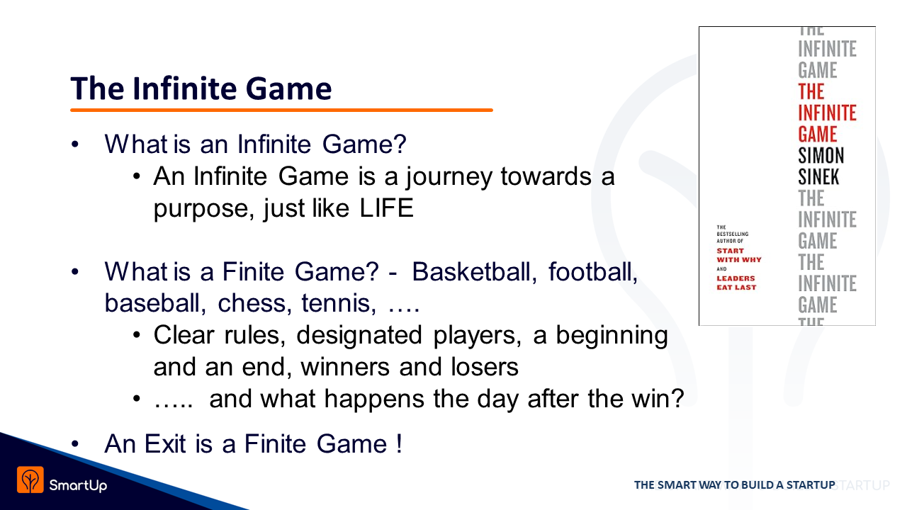 The book could have been an article. You know, the main messages are pretty short, but it’s a book. And he’s talking about the difference between an infinite and a finite game. And what is an infinite game? It’s a journey towards a purpose. And the example that he gives is life. Hopefully there’s no quick exit of the game. You really want to stay and play the game. So that is an infinite game. What is a finite game? A lot of games that, you know, basketball, football, baseball, chess, tennis, you name it. And what are the rules? So you have clear rules, right? If you play baseball, there are rules for the playboy, there is designated players, you know, who plays against you. There’s a beginning and an end, and there are winners and losers. That’s how a finite game is played.