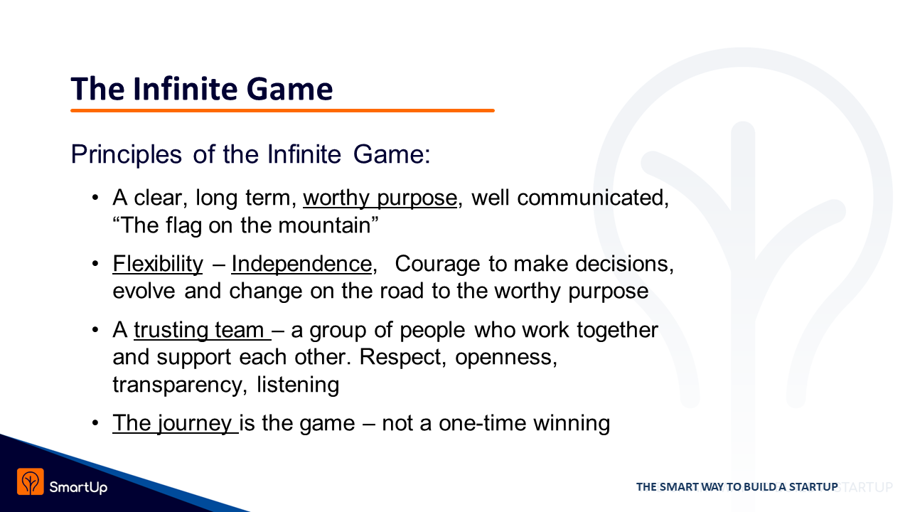 An exit is a finite game. Regardless of whether you sell your company or you do an IPO zoom info today doesn’t look at all like it used to look when it was a private company, because there are quarterly meetings and you need to hit certain targets, and it drives the whole company nuts. So what are the principles of the infinite game? First and foremost, you need a clear, long term, worthy purpose, well communicated. I call it the flag on the mountain or the flag on the hill. So you have to know and communicate to everybody what you want to be when you grow up, and you never grow up either way. So Smartup academy is this.