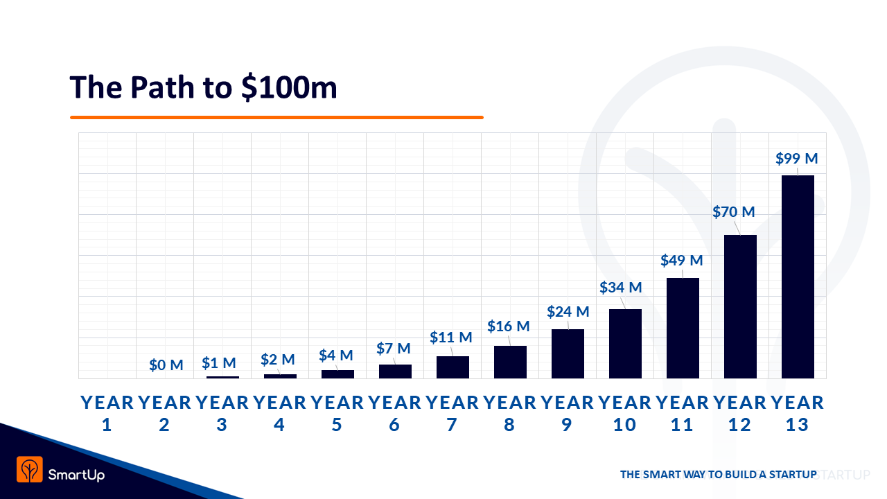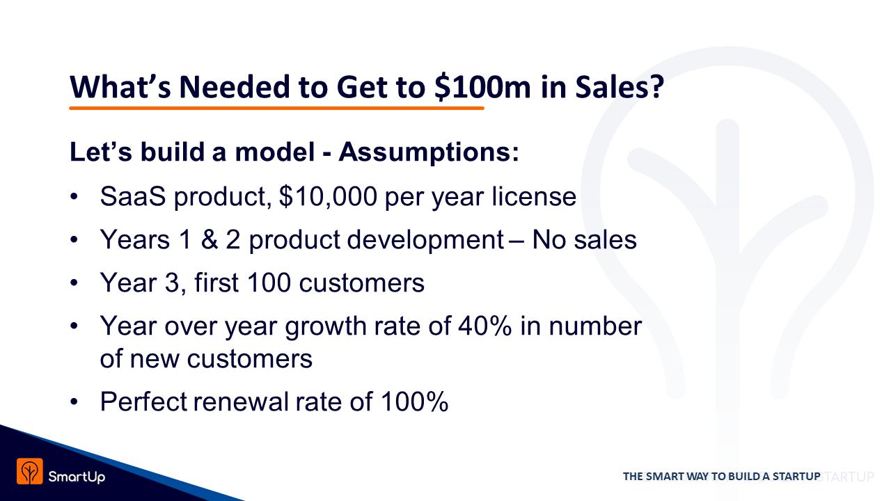 So this is the infinite game. And smartup is the infinite game. And I urge you, when you build a company, think about that. For a company to GO pUblic, it needs to have revenues of 100 million and up otherwise it’s not very interesting. Year over year growth of 20% and preferably profitable. Okay, so let me show you. Remember, the language of business is money. So we’re going to build a model, very simple model. I’ll take you through the model and show you the reality of building a company that looks as simple as that. Okay, so it’s a SaaS product. I took the simpler thing. Okay, you have a software product. Software as a service, $10,000 a year license, pretty simple. Years, one or two, product developmeNt. Remember we said you start with the product like everybody else, no sales.