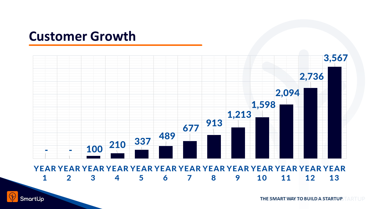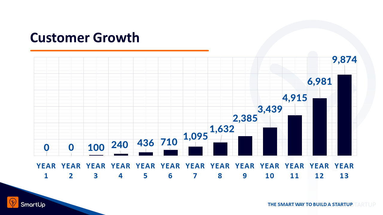 Year three, boom, 100 customers like that out of the box. Because in year two you were working on lead generation and what HavE you. Year over year growth of 40%, like clockwork, 40% new customers and perfect renewals. Anybody who bought from you on year three will buy from you in year 13. You don’t lose a single customer. The best company ever. Okay, here are the number of customers you have. Year one and 20, 100 year two, year four. Actually it’s 100 plus 40% growth in new customers, right? So it’s 100 and 4100 plus 140 is 240. Trust me, this is the same formula. So you get to 1000 to 910,000 customers in year 13. I assume 40% year over year growth. What is linear about it? You want it to be exponential. You want to grow that, the growth will be exponential.