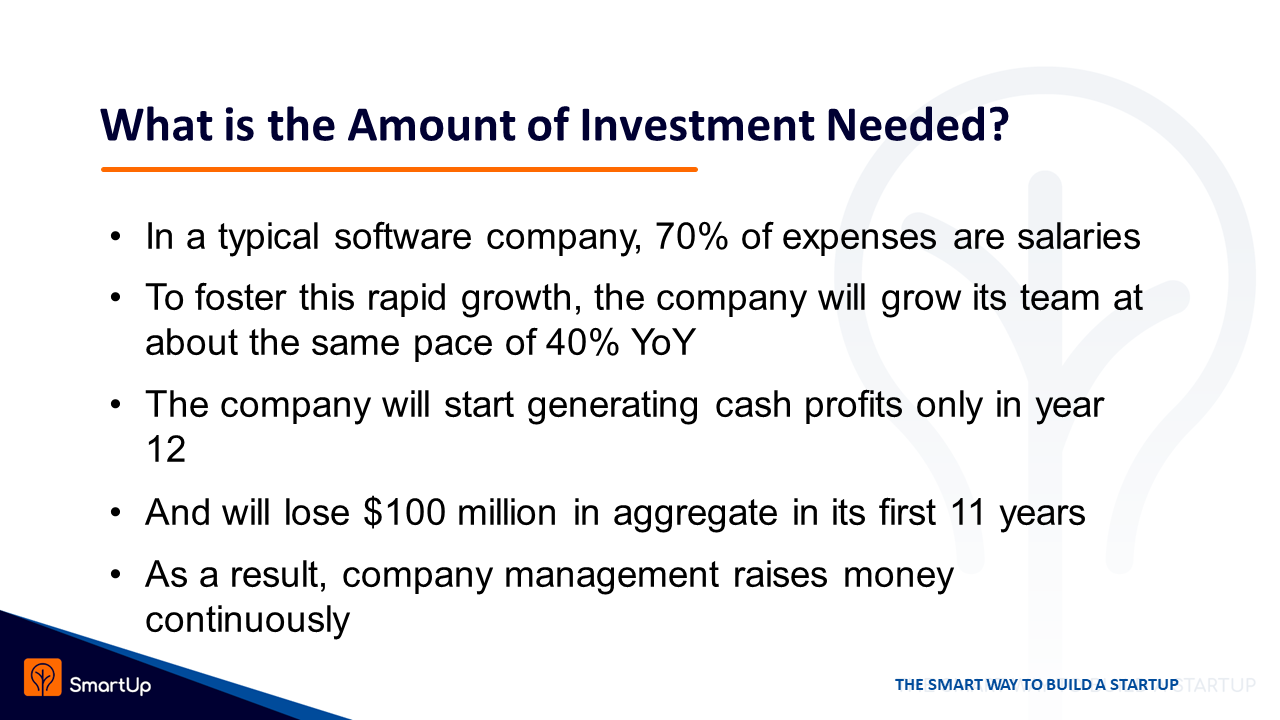 No, it usually doesn’t happen. Most companies, if they grow 40% year over year for ten years, they have a book written about, okay, we multiply that by $10,000 per license and you get to 100 million on year 13. That’s with perfect assumptions. Okay, everything goes for you. Really good. Okay, what is the amount of investment you need? So in a typical software company, 70% of expenses are salaries. Okay. So as I said to you, the biggest expense you’re going to have is always people. What are the other 30%? Rent, travel, lawyers, you name it changes from, yeah, but even not, you know, if you’re a medical company, right, pharma company, what do you spend the money on? Doctors, professors, and do the work. Labs. So do you have fixed investments? But they’re small compared to the salaries that come out months after months.