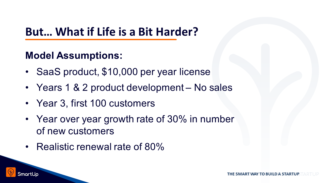To foster this rapid growth, right? 40% year over year, the company will grow its steam about the same rate, 40% year over year. And the company will start generating cash profits only in year twelve. And we lose 100 million aggregate in the first eleven years. So you need to raise the 100 million in order to get to $100 million in sales. As a result, the company raises money continuously. So management is in a constant pace, you know, raising money, raising money all the time, which is a big disruption of attention. But often, what if life is a bit harder? So same ideas, right? Except it grows only 30% year over year, and renewal rate is only 80%, which is fairly realistic. What happens then? So I don’t need to show you the other one, right? 35 67 means $35 million.