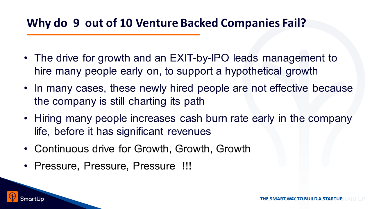 He says, yeah, we hired 50 more people. And I’m like, oh, my God, you know, you just spent $5 million a year. Now, that’s not how you measure growth. But people do measure growth by how many people they hired, which is basically just putting a bigger and bigger weight on the company. So as I said, now. And continuous drive for growth, growth puts tremendous pressure. Why? Because after a while, people look at the budget and they say, oh, my God, yeah, I have $5 million in the bank, but I spend a million dollar a month. So that means I have five months to live. That’s scary. That’s very scary. So what happens? So you have difficulties raising additional money. The problem with raising money is it is very dependent on things that are beyond your control. There is a war October 7. Everything stops.