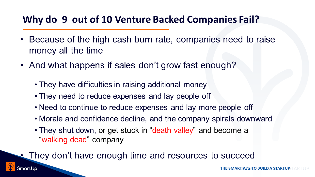 They’re going nowhere, but they have enough money to sustain themselves and they keep going, no IPO, no m. And a just a headache for the VC because they still have them on their books. They still need to worry about them, but they’re going nowhere. That’s what they call the walking dead. Nice company, doing fine, getting a salary every month, but just not interested. So when you hear the walking dead, that’s what it means. And that’s really is where the walking dead walk to. Okay, so the problem is they don’t have enough time and enough resources to succeed. As I showed you, it takes many years to succeed for an IPO. Okay, I think I convinced you that life is not easy. So how not to fail? So you have to change the goal of the company.