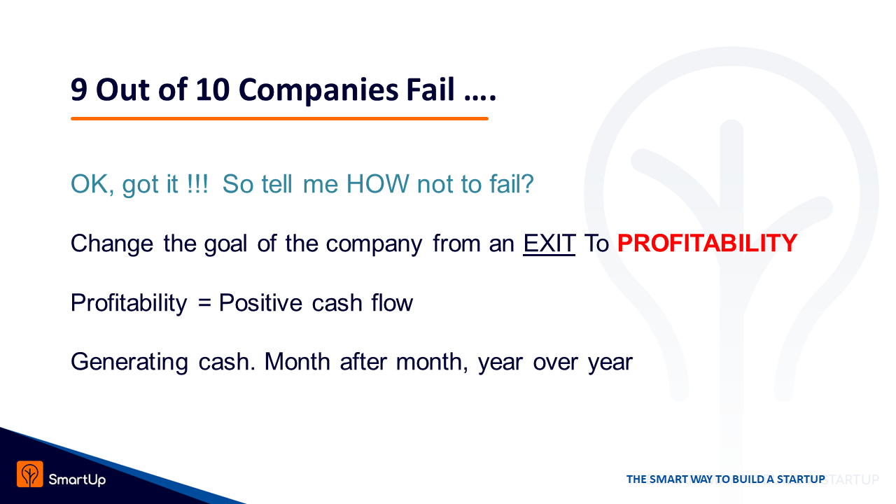 And that’s a really fundamental change from exit to profitability. Sounds trivial, right? Yeah. What’s the difference? Well, there’s a huge difference in the way you think and what you do. First of all, I want to define what profitability is. Those of you who are familiar with the financial Norman culture. Well, I’m not talking about profitability by what lawyers and accountants say profitability. I’m talking about positive cash flow. Positive cash flow means how much money you have in the bank months after months. Do you see your bank account going up, or do you see your bank account going down? The language of business is money. Very easy to track. It’s linear. See, that? Goes up, goes down. So you really want to be in a position where every month you look at your bank account, money goes up, month after month, year after year.