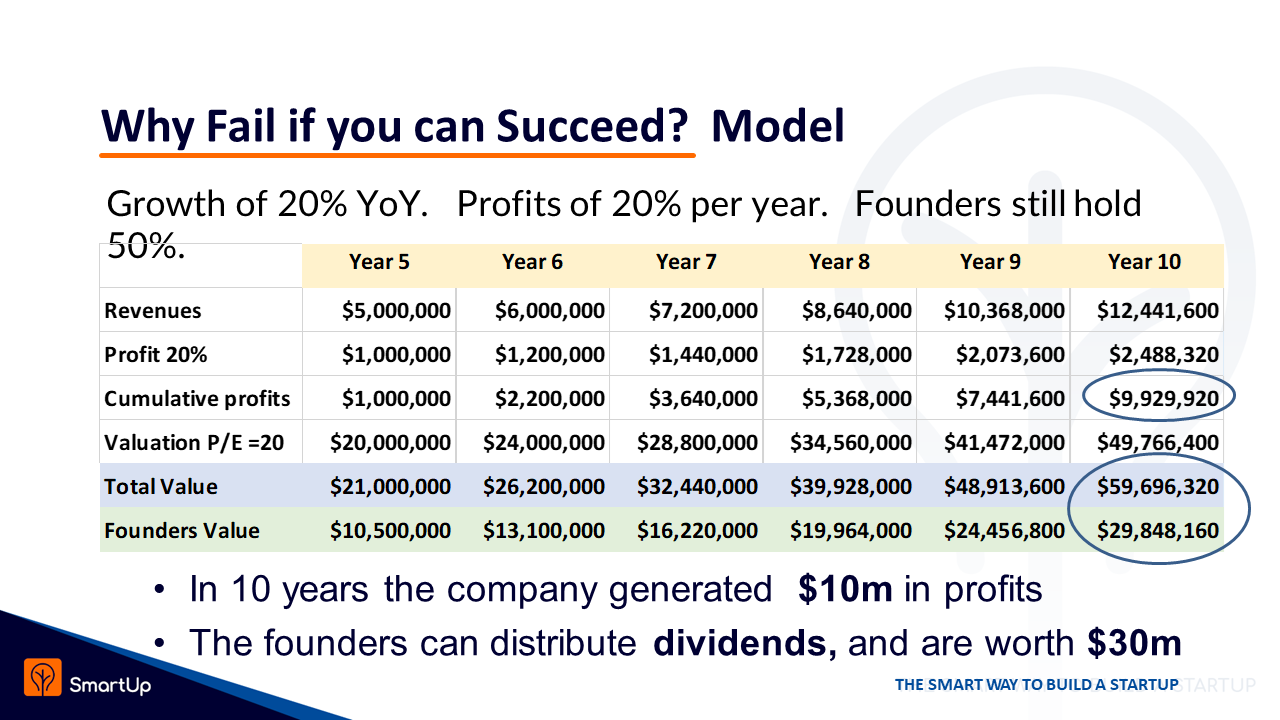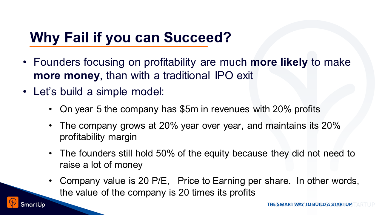 Founders focusing on profitability are more likely to make More money. So I’ll do another model very quickly because we are running out of time, unless you really want to stay here till 730 and you have all the time in the world. So let’s take a small company. On year five, they did $5 million in revenues with 20% profits. Okay? The company grows at 20% year over year, but remains profitable at 20%. And the Founders, because they raise, you know, just a little bit of money from angel investors, still hold 50% of the equity, and the company value is 20 times P two E. P says price to earning Per share. Okay? Because you buy shares in the Market, so they have a price. Usually they calculate the price to earning per share.