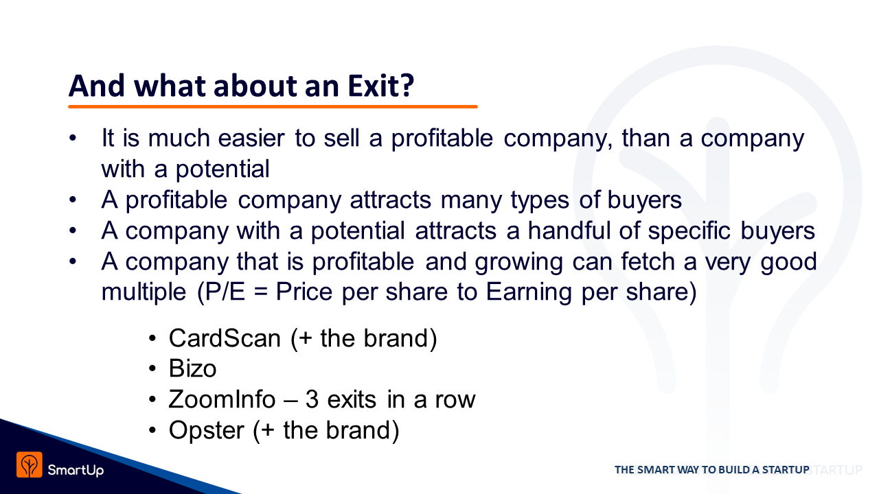 I don’t know how many of you were in a company that needs to raise money all the time, but people who give you money have requirements and they feel they can dictate what you can do or not do. And many times new investors try to push you in directions that you don’t believe are the right directions. But you have no choice. You need the money. So being profitable on your own makes you independent. When people ask me, why are you so keen on making money, my answer was not, I want to be rich. It was freedom. I am the boss. I can do whatever I want. So I was making money at Cardscan and I wanted to create Zoom info. And the investors said, why do you want to do that? Because it’s cool. And he said, you’re nuts. We are against it.